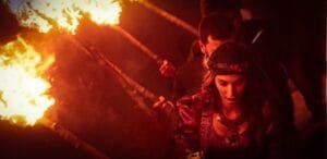 Draped in the Kurdish flag, a young Kurdish woman stands before the Newroz fire in Basur (Kurdistan in Iraq). Photo: Instagram/SA