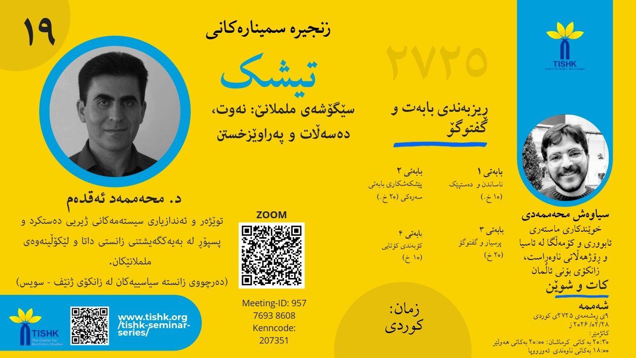 ناوەندی لێکۆڵینەوەی کوردستان-تیشک، لە درێژەی زنجیرە سمینارەکانی ساڵی ٢٠٢٦دا، ڕۆژی یشەممە ڕێکەوتی ٩ی ڕەشەمەی ٢٧٢٦ی کوردی (٢٠٢٦/٠٢/٢٨)، نۆزدەیەمین سمیناری خۆی لەژێر ناونیشانی: “سێگۆشەی ململانێ: نەوت، دەسەڵات و پەراوێزخستن”، لەگەڵ د. محەممەد ئەقدەم، بەڕێوەدەبات.